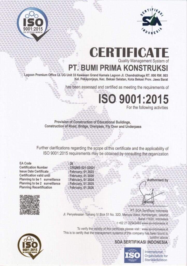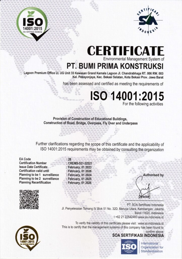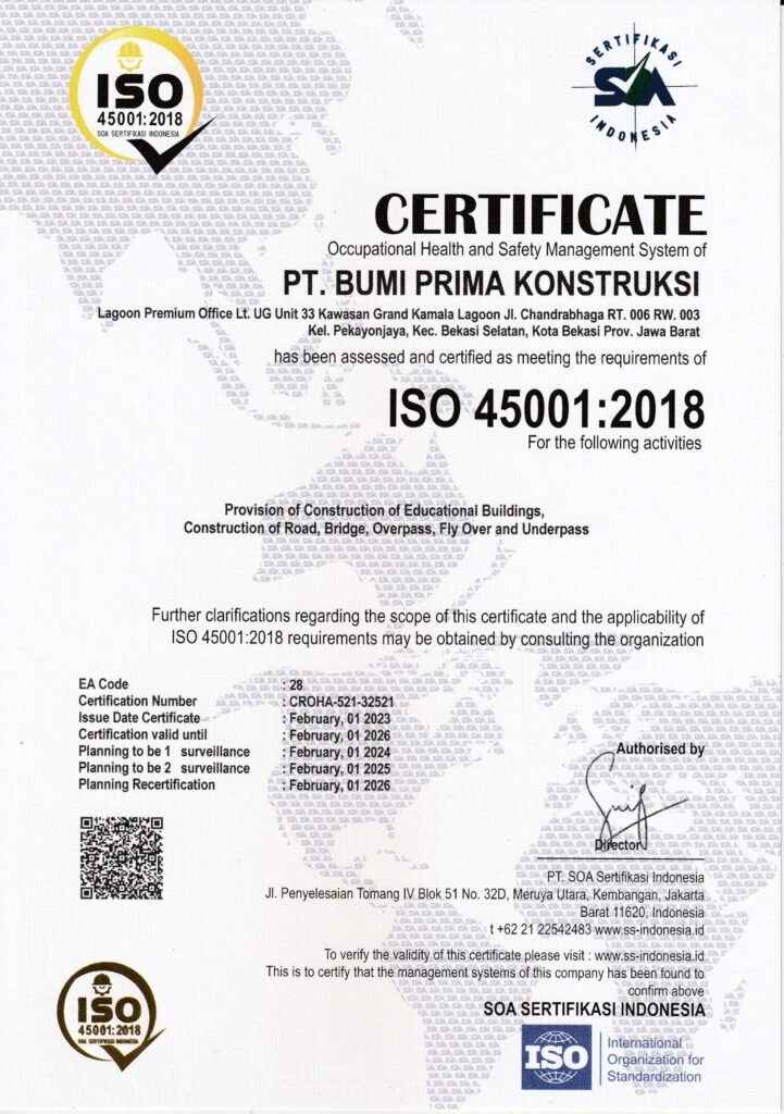 PT. Bumi Prima Konstruksi merupakan perusahaan kontraktor yang bergerak dalam pekerjaan Pondasi Bore Pile, Tiang Pancang, Erection dan Penyewaan alat berat Perusahaan ini berdiri pada bulan Juli 2019 beralamat di Lagoon Premium Office Lt. UG Unit 33 Kawasan Grand Kamala Lagoon Jl. Chandrabhaga RT 006 /003, Pekayon Jaya, Kec. Bekasi Selatan, Kota Bekasi 17148 Salah satu usaha kami untuk senantiasa memberikan hasil terbaik bagi klien adalah dengan merekrut tenaga ahli profesional dan sarat berpengalaman. Kami memiliki standart mutu yang tinggi dalam menyelesaikan setiap pekerjaan karena kepuasan klien adalah prioritas kami. Tercapainya setiap karya konstruksi yang kami bangun tidak lepas dari komitmen dan kerja keras oleh, baik mereka yang berada di lapangan maupun yang berada di kantor pusat.